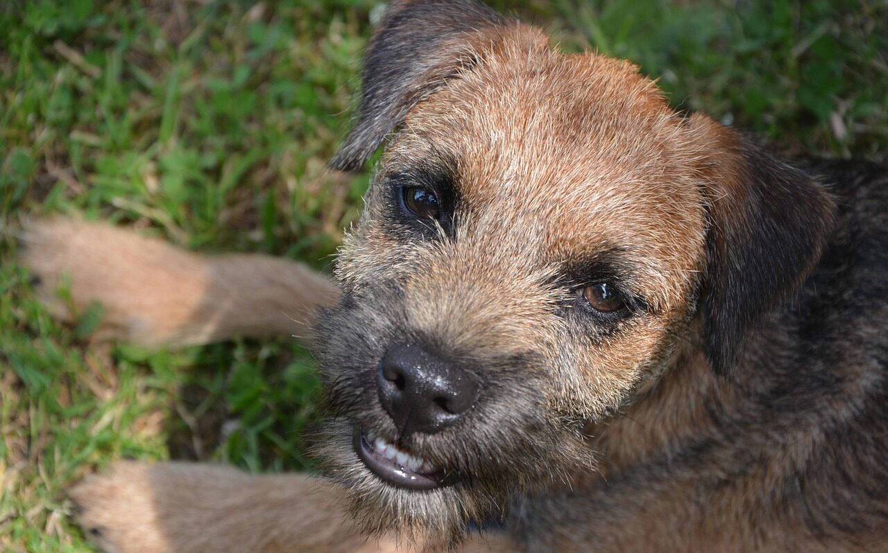 De Border Terriër heeft een kenmerkende “otterkop” – een breed, plat hoofd met korte snuit – en een alerte uitdrukking.