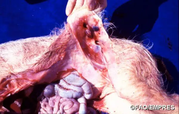 Download de informatiefolder Afrikaanse VarkenspestOpent in een nieuwe tabEuropese varkens (wild zwijnen) en hun gedomesticeerde soortgenoten gaan na besmetting vrijwel allemaal dood. Het virus tast de bloedvatwand aan, waardoor overal in het lichaam bloedingen ontstaan. Het beeld lijkt op ebola bij de mens. Bij het ontweiden kunnen puntbloedingen of uitgebreide bloedingen zichtbaar zijn in onder andere hart en nieren. De milt is vaak donker gekleurd en sterk vergroot, met bolle randen. De lymfeknopen zijn vergroot en bevatten bloedingen. De ziekte is zonder laboratoriumonderzoek niet te onderscheiden van klassieke varkenspest. In Afrika levende wilde varkenssoorten, zoals het wrattenzwijn, vertonen meestal geen ziekteverschijnselen.