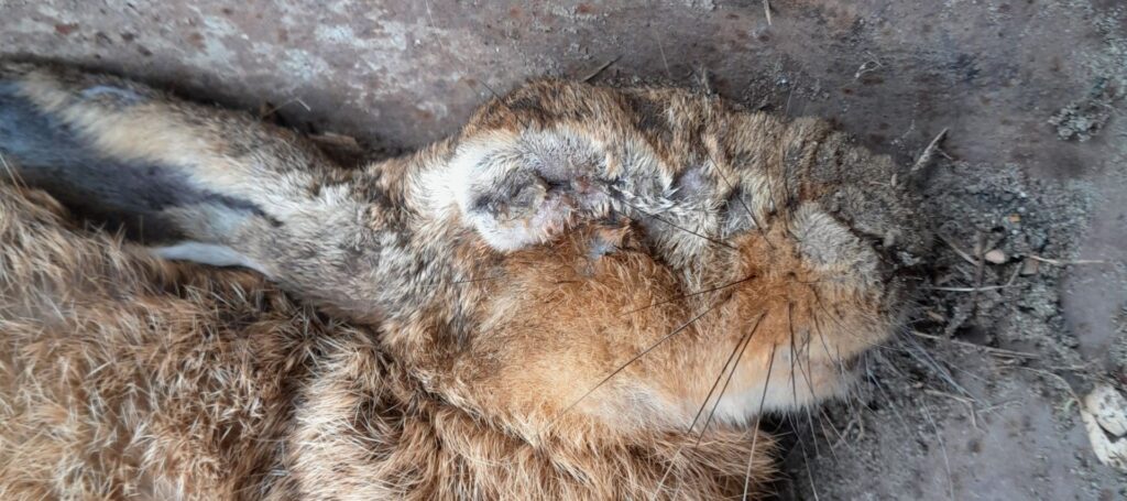 Veel zieke en dode hazen hebben verdikking met ontstekingen van de huid rond de ogen en neus, en rond de anus. Zieke dieren gedragen zich apathisch, lijken blind en vallen om. Vaak worden dode hazen buiten hun leger aangetroffen. Bovendien is bij veel besmette hazen ook longontsteking vastgesteld.