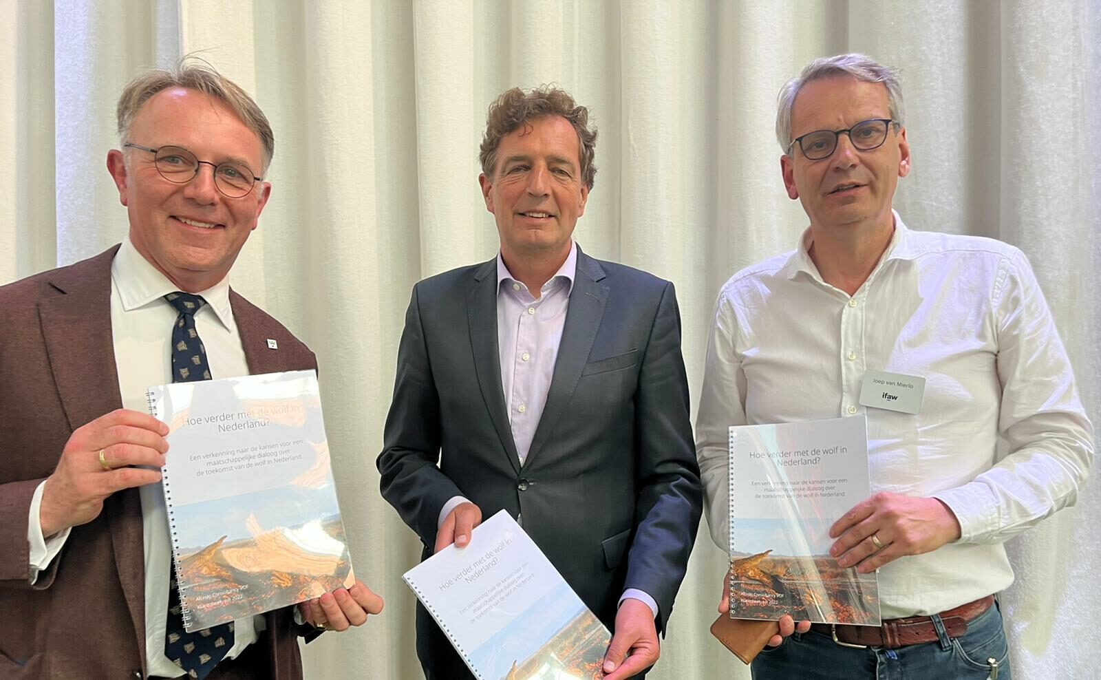 Gisteren, woensdag 6 juli namen International Fund for Animal Welfare (IFAW) Nederland en de Koninklijke Nederlandse Jagersvereniging het rapport Hoe verder met de wolf in Nederland? Een verkenning naar de kansen voor een maatschappelijke dialoog over de toekomst van de wolf in Nederland in ontvangst op een bijeenkomst in de Mauritskazerne in Ede. De gemeente Ede was gastheer van deze bijeenkomst.