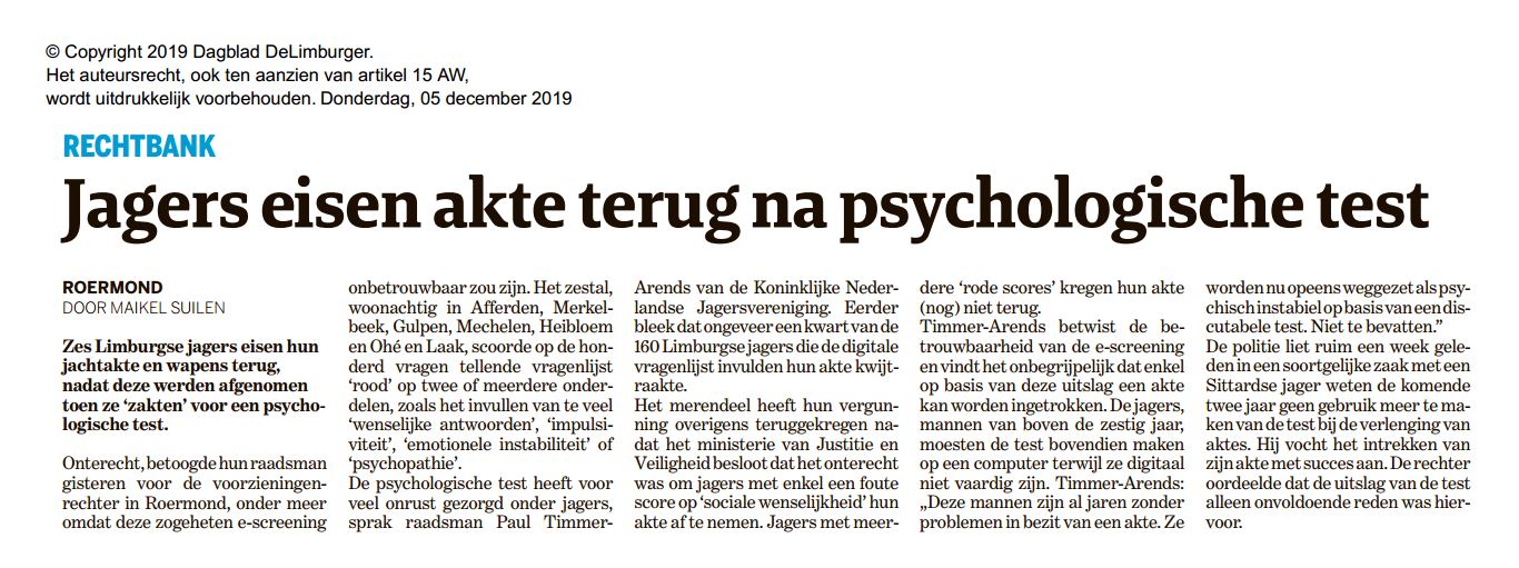 Jagers eisen akte terug na psychologische test – De Limburger (5/12)