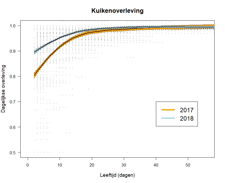In het voorjaar van 2018 (blauw) was de dagelijkse overleving van eendenkuikens aanzienlijk hoger dan in 2017 (oranje), mogelijk als gevolg van het warme, droge weer in 2018. In de eerste paar weken van hun leven zijn eendenkuikens erg kwetsbaar voor slecht weer en predatie.