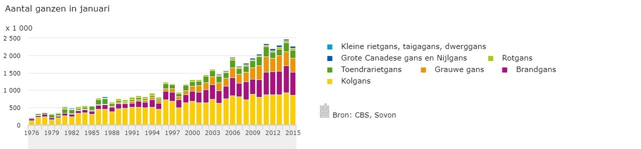 Het aantal ganzen in NL in januari. bron: CBS, SOVON