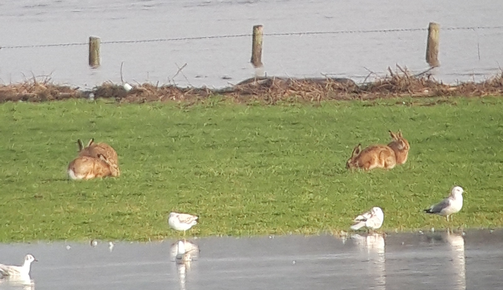 Wijnhoven: ‘Die verhoging is nu bij het hoogwater ook gebruikt door de hazen en konijnen. Alleen voor jonge hazen, die we nu ook al hebben gezien, is de heuvel eigenlijk net te ver en er zouden meer struiken op moeten staan om het wild dekking te geven, maar dat is weer lastig in verband met regelgeving rond overloopgebieden. Tijdens het hoogwater in 1994 en 1995 hebben we hier veel hazen en konijnen met schepnetjes kunnen redden. De praktijk is dat je er dan zeker een aantal kunt redden, maar veel hazen gaan dan ook al dood van de stress en verdrinken alsnog. Zo’n vluchtheuvel is een veel betere oplossing.’