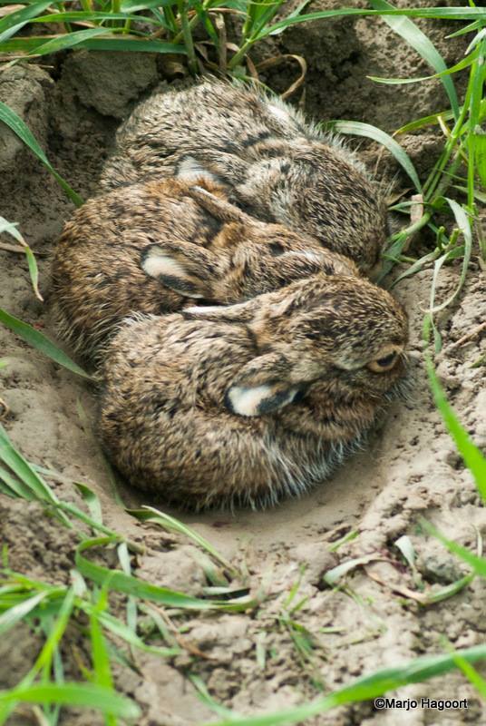 Afgelopen week liep een jager tijdens een wandeling door het veld en stuitte op deze worp jonge haasjes. Na het maken van een foto liet zij de haasjes verder met rust. Dat is de enige juiste manier om met deze jonge dieren om te gaan. De moerhaas (het vrouwtje) komt haar jongen namelijk met regelmaat in het veld zogen.