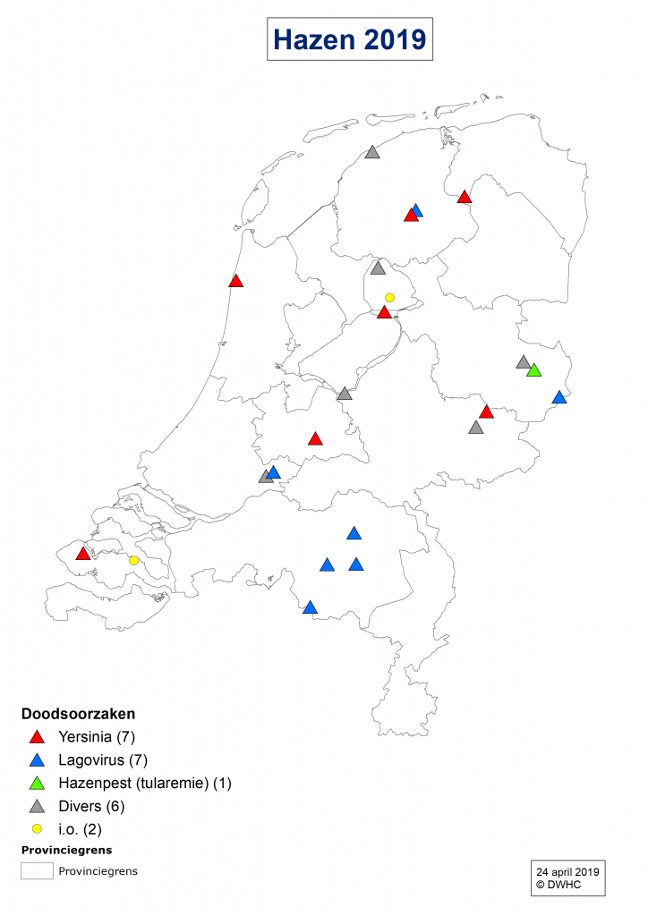 In 2019 zijn tot half april bij het DWHC 23 hazen onderzocht. Er zijn diverse doodsoorzaken gevonden. Naast de haas met tularemie, zijn onder andere 7 hazen doodgegaan door besmetting met de bacterie Yersinia pseudotuberculose en 7 hazen door besmetting met een lagovirus (EBHS of RHDV-2).