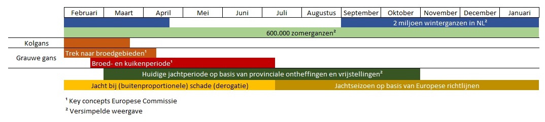 Ganzen in Nederland broeden vanaf februari, tot begin juli verzorgen zij hun jongen en ruien zij hun vleugelpennen. Dit betekent dat ganzen en hun jongen een aantal weken beide (nog) niet kunnen vliegen. Overheden maken van deze kwetsbaarheid gebruik om de aantallen ganzen in hun provincie terug te brengen. Dit doen zij onder andere door het vernielen van eieren en nesten, het (laten) schieten van ganzen terwijl ze op het nest zitten, en het vangen en vergassen van ganzen en hun jongen. In ons land mag in de meeste provincies van maart tot en met oktober worden gejaagd op ganzen, om schade te voorkomen en om de populaties terug te brengen in aantal.
