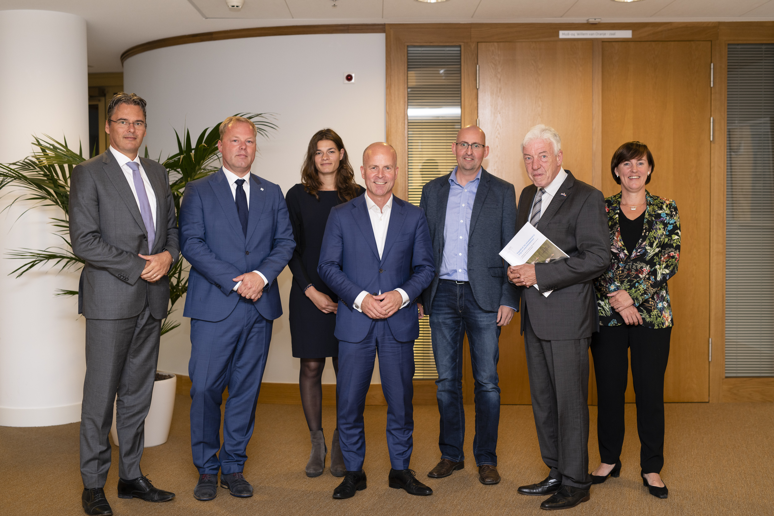 Staatssecretaris Knops van Binnenlandse Zaken en Koninkrijksrelaties (midden) neemt het Sira-rapport ‘Regeldruk bij schadebestrijding en populatiebeheer’ in ontvangst uit handen van Willem Urlings (tweede van rechts), voorzitter van de Jagersvereniging.