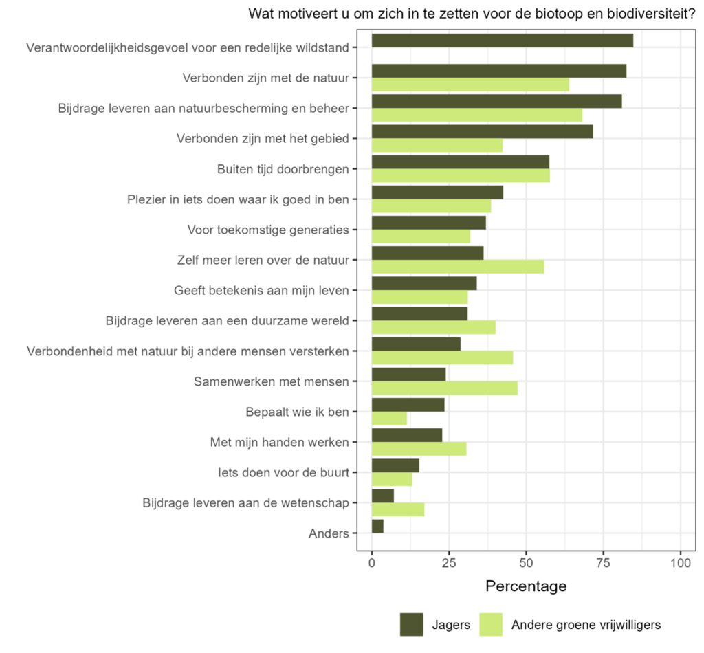Samenwerken met andere mensen en de verbondenheid met de natuur van andere mensen versterken leeft meer bij andere groene vrijwilligers dan onder jagers. Toch geeft een kwart van de deelnemers aan dat samenwerking en bewustwording bij anderen hen motiveert. Dat zien we ook terug in de vele prachtige initiatieven van leden om het héle verhaal van de jager te vertellen. Ook uit de overige resultaten van de enquête blijkt dat jagers zich juist gezamenlijk inzetten voor de biotoop en de biodiversiteit. Samen met grondgebruikers, samen met WBE’s, samen met TBO’s en met agrarische (natuur) collectieven.