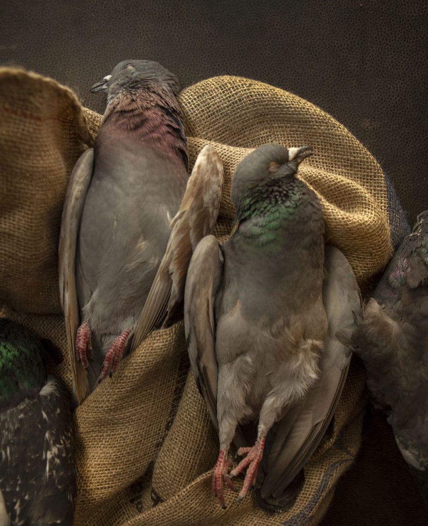 Het uiterlijk van de stadsduiven vergelijken met dat van de houtduiven is onmogelijk, de poelier heeft ze ontdaan van veren, kop en ingewanden. Naast elkaar op de snijplank zijn er weinig verschillen te zien. De houtduiven zijn iets groter, daar houdt het wel mee op. Om eerlijk te kunnen proeven moeten de rompjes, met poten en al, zachtjes worden gekookt, zonder uien, knoflook of kruiden toe te voegen. Dat is jammer. Een kok wil meer dan koken alleen.