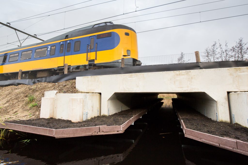 Hoogenstein vertelt dat er zeven grotere passages zijn gebouwd en dat ingenieursbureau Movares daarbij nog eens twee kleinere passages onder de spoorbielzen heeft aangelegd. ‘Na enkele dagen maakten ringslangen en boommarters al gebruik van die kleinere passages.’ Het treinspoor scheidt de zuid- en de noordkant van het Naardermeer. Met de aanleg van de zeven faunapassages, waaronder twee natte onderdoorgangen, kunnen reeën, vossen, ganzen met hun pullen maar ook de das en de otter migreren. ‘We hopen vooral dat de populaties dassen en otters gaan groeien nu zij een groter leefgebied krijgen.’