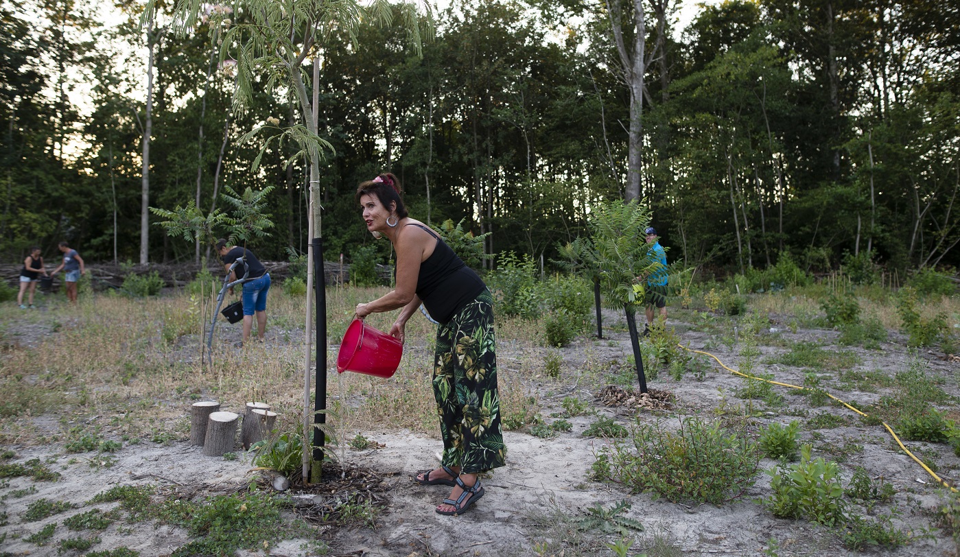 Samen met Lydia Waterreus, die vrolijk ronddartelt en de aanwezige vrijwilligers voorziet van gieters, emmers en glaasjes limonade, is Derksen grondlegger van het Zeewoldse voedselbos. ‘Begin 2018 zijn we gaan planten: eerst de kruinlaag en struiklaag. Veel later komen de bodembedekkers.’ Dit moet vervolgens langzaam uitgroeien tot compleet ecosysteem dat voedsel oplevert voor mens en dier. Derksen: ‘Wij ontwerpen een vitaal ecosysteem naar voorbeeld van een natuurlijk bos.’
