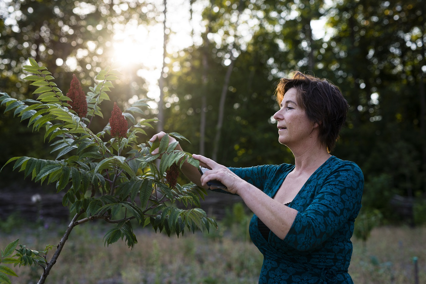 Ze staat op en loopt naar een sprietig boompje met rode kegelvormige bloemen dat ze definieert als fluweelboom: ‘Deze vrucht geeft donkerroze limonade die lekker is met een beetje suiker. En dit is een Chinese mahonie’, wijst ze een ander ontluikend boompje aan. ‘Het blad smaakt naar uiensoep en je schijnt het hout zachtjes te kunnen stoven om als bouillon te gebruiken.’