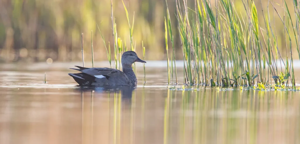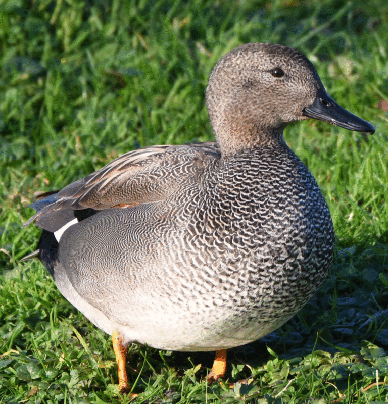 Krakeend (Anas strepera), E: Gadwall, D: Schnatterente, F: Canard chipeau.