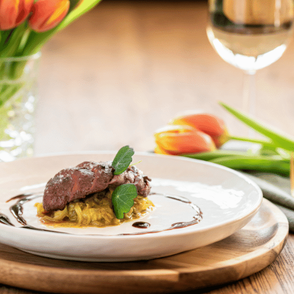 Een klassiek Frans geïnspireerd wildgerecht: langzaam in ganzenvet gegaarde houtduifpootjes met gevulde duivenfilets, geserveerd met een zoet-zure hete bliksem en calvadossaus. Een feestelijk gerecht voor de echte wildliefhebber.