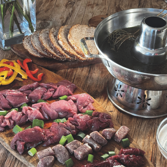 Een licht en feestelijk gerecht waarin malse stukjes wild kort worden gegaard in een geurige bouillon. De combinatie van verschillende vleessoorten, groenten en huisgemaakte sauzen zorgt voor een culinaire beleving aan tafel.
