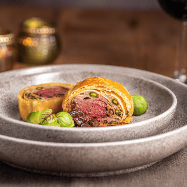 Een feestelijk hoofdgerecht voor de wintermaanden. De malse hazenrugfilet wordt verpakt in een dun pannenkoekje en bladerdeeg, gevuld met een smeuïge farce van kip, rozijnen en pistachenoten. Serveer met een rijke, kruidige pruimenjus voor een diner om indruk mee te maken.