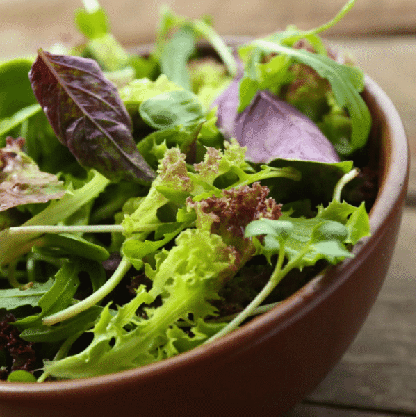 - Doe de spinazie en rucola in een kom en meng. Klop in een kannetje de dressing van frambozenazijn, olijfolie en zout en zet op tafel.