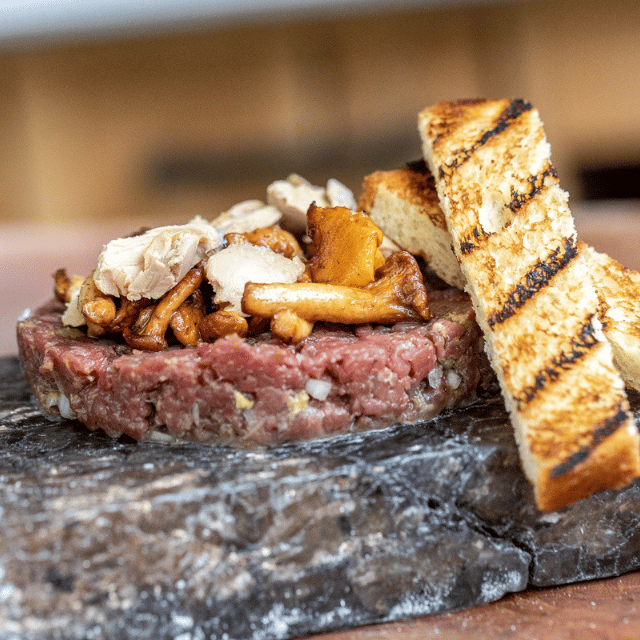Een verfijnd en stoer gerecht waarin de pure smaak van ree centraal staat. De platte bil (picanha) wordt rauw verwerkt tot een malse steak tartaar, die op een verwarmde zoutsteen net dat extra vleugje warmte en smaak krijgt. Geserveerd met gebakken girolles en geroosterd briochebrood — perfect voor een bijzondere avond.