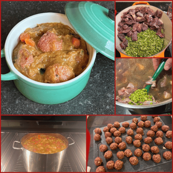 Een stevige winterse klassieker met een wild twist — rijkgevuld met wild zwijn, rauwe ham en kruidige ganzenchorizo-balletjes. Perfect om mee op te warmen na een koude dag in het veld.