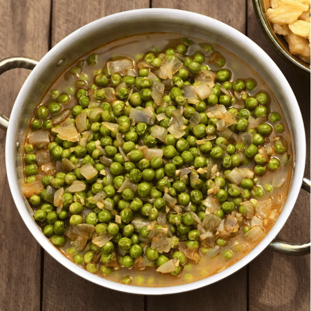 - Stoof de diepgevroren erwtjes in een klont boter en een scheutje water rustig gaar. Serveer de stoof met rijst en erwtjes in diepe borden of kommen.